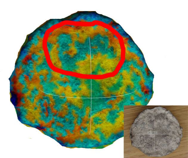 Meshlab itself is an interesting but somewhat limited program, but the Colorize Curvature (APSS) filter seems promising, as it changes the texture colour based on the inclination of the surface. The papers regarding the filter are extremely technical, which at the moment make it difficult for me to understand the process in detail, but with an extremely high MSL – Spherical Parameter (even 10000000000) and an approximate mean Curvature Type the results above come out.