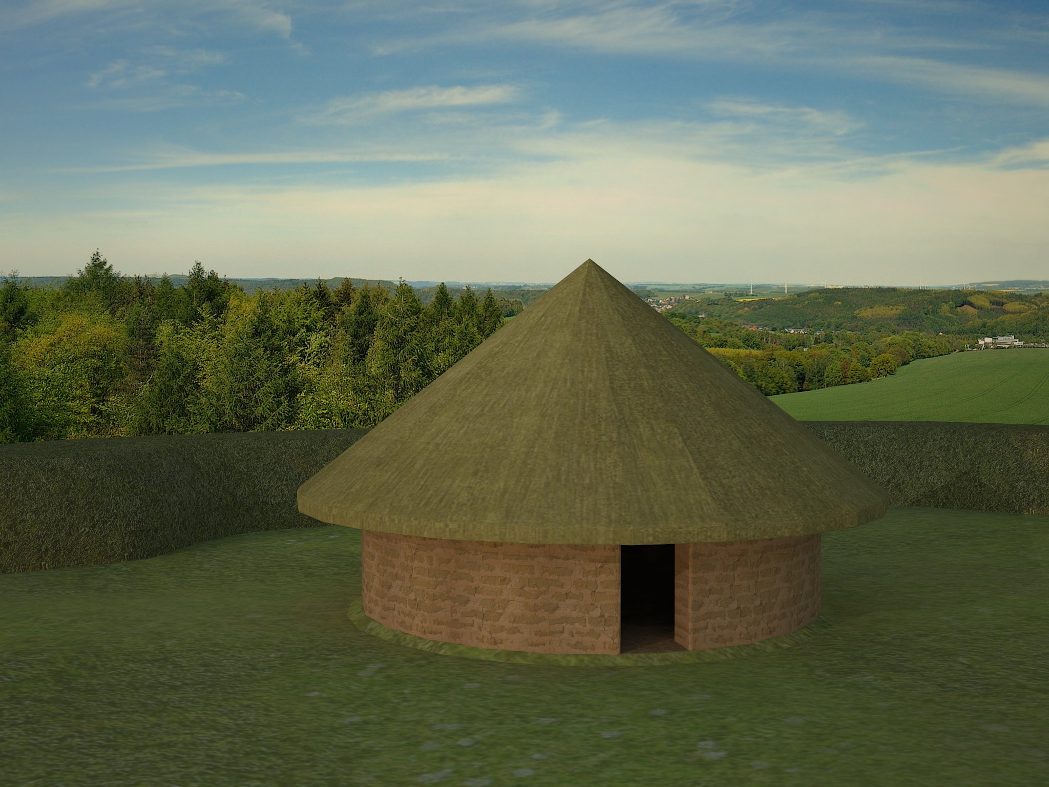 One of the projects I’ve been working on has been reconstructing a roundhouse we found at Caerau, Cardiff, using Sketchup to create the main frame, and V-Ray to render it as an image. This will then be used to fade over some footage of the archaeological site, to show a transition between what we can see and what would have been present on site.